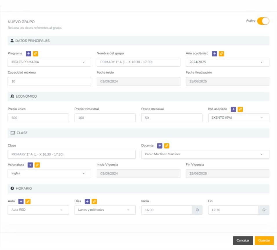 Conoce rápidamente las plazas disponibles en tus grupos y consulta los detalles sobre duración, precios, listado de estudiantes...